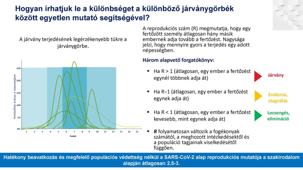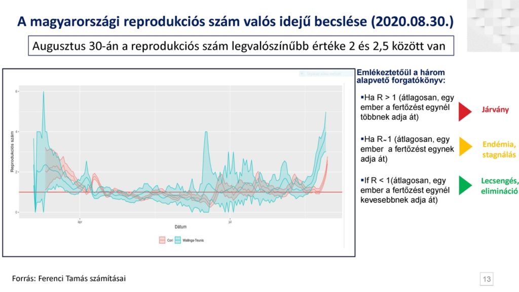 Dr. Oroszi Beatrix példaként említette, hogy az első hullám során a kormányzati intézkedések hatására bekövetkezett 60-90 százalékos kontaktuscsökkenésnek – amelynek szükségességét járványmatematikai számítások is megalapoztak – nagy szerepe volt abban, hogy kontroll alá került a járvány. A vírus terjedését jelző ún. R-érték (ami megmutatja, hány embernek adja tovább átlagosan egy fő a fertőzést) augusztus elején mozdult el ismét az 1 körüli biztonságos tartományból. Az aktuális helyzetről elmondta: a második hullám erősebbnek tűnik, az elmúlt időszakban voltak napok, amikor több fertőzöttet regisztráltak, mint az első hullám csúcsnapjain.