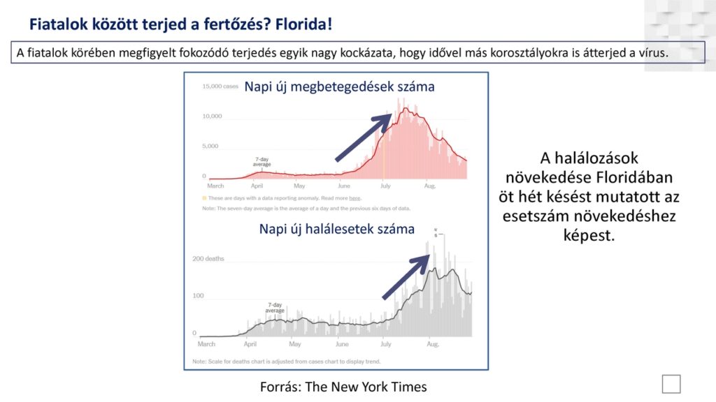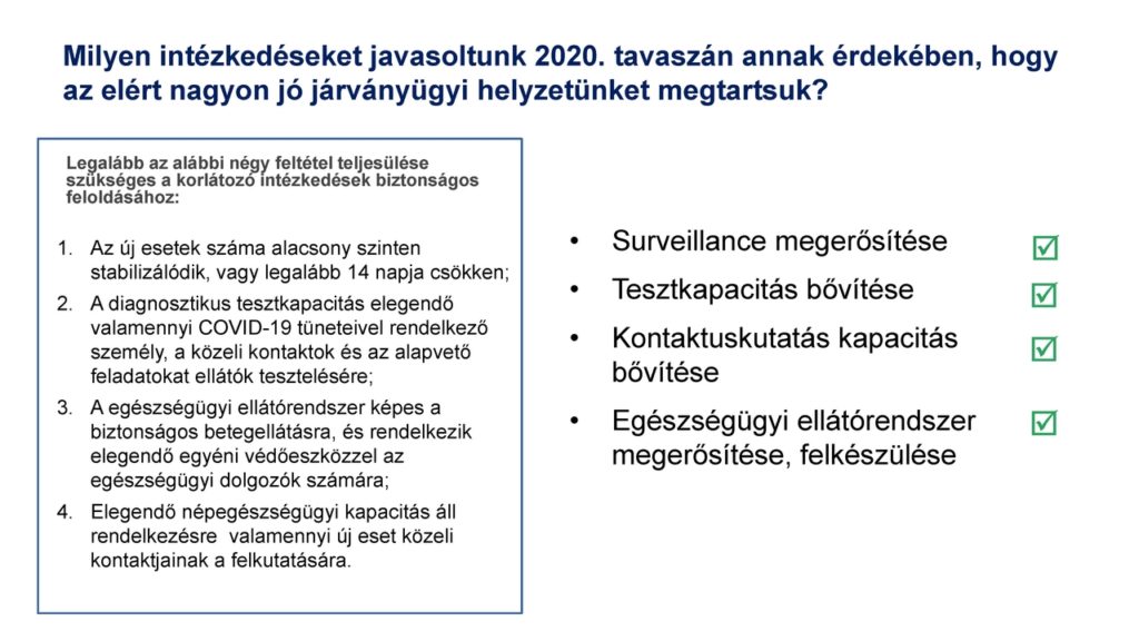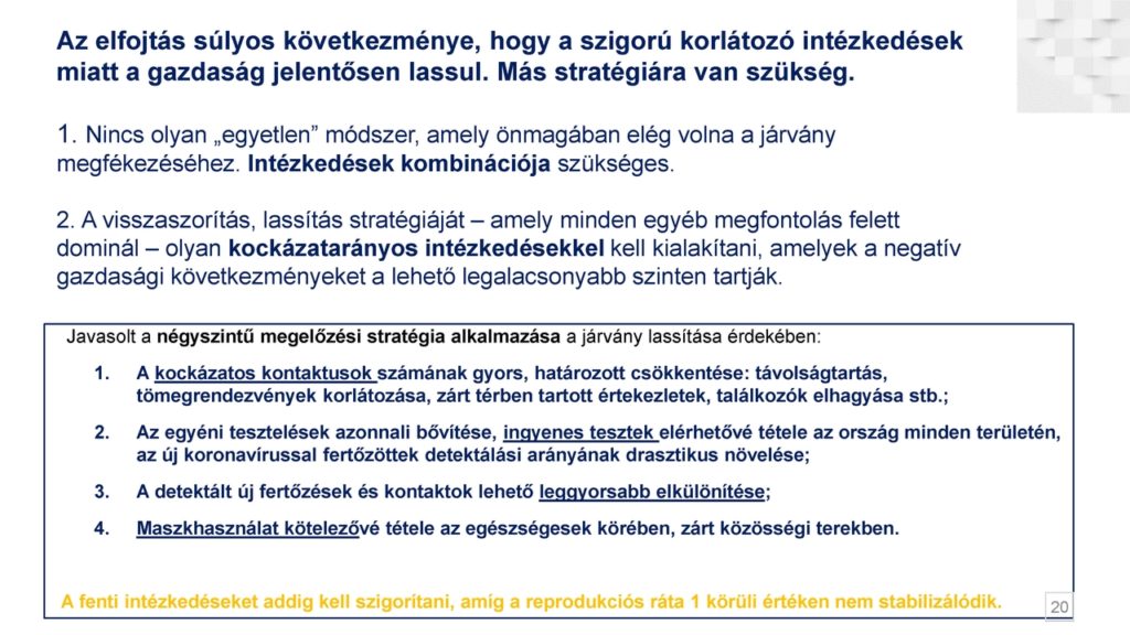 Szintén megfigyelhető, hogy dominál a közösségi fertőzés és jellemzően most egyelőre nem az idősebbek, hanem a fiatal korosztály az érintett. Ismertette a megfékezésre tett javaslatokat is, hangsúlyozva, hogy a visszaszorítás, lassítás stratégiáját – amely minden egyéb megfontolás felett dominál – olyan kockázatarányos intézkedésekkel kell kialakítani, amelyek a negatív gazdasági következményeket a lehető legalacsonyabb szinten tartják.