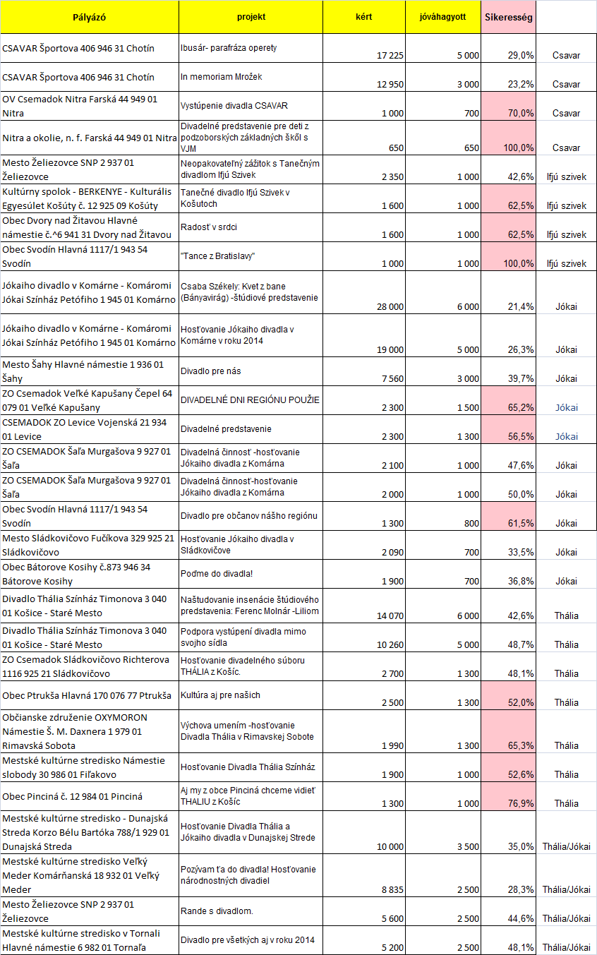 - a „sikeres pályázatok aránya” oszlop tartalmazza a leadott pályázatok közül elfogadottak százalékos arányát.