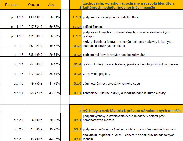 Nyilvánvaló, hogy az összesen 359 pályázóból a harminc legsikeresebb pályázó kapta a források több mint felét. Százalékos elosztásban az első tíz kapja a támogatások csaknem 30%-át, a második tíznek jut a támogatások 13%-a, és a harmadik harmadnak meg kell elégednie a támogatások 8,5%-val. A fennmaradó 329 pályázónak jut a maradék. Mivel itt természetesen nem ugyanolyan témájú és jelentőségű pályázatokat hasonlítunk össze, ezek az adatok nem jelentik azt, hogy a listában nem szereplő pályázók nem fontosak, csak vagy keveset kértek, vagy keveset kaptak… A továbbiakban konkretizáljuk, ki milyen tevékenységre kapott támogatást, mert ezek az adatok is segítenek átláthatóbbá tenni a szlovákiai magyarság kulturális életét. Az, hogy a rendszerben vannak pályázók, melyek több alprogramban is adtak be pályázatokat, néha megzavarhatja az áttekinthetőséget. Az elemzett alprogramonkénti statisztikák az 1.1.1, 1.1.2 és 1.2 kategóriákban mutatnak olyan átlagon felüli adatokat, amiken érdemes elgondolkodni. Ezekben a kategóriákban vannak jelen ugyanis a legtámogatottabb pályázók.