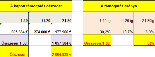 A fenti két táblázatból látszik, milyen arányban részesülnek az egyes pályázók a rendszerből. A kimutatásban az első táblázatban látható harminc pályázó adatai vannak tízesével összehasonlítva az összes pályázó által elért eredménnyel.