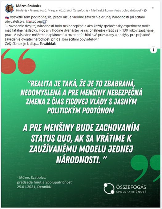 Zorán Ardamica ha végigolvasod a cikket, akkor láthatod: nem azt állítom, a második nemzetiség vagy a kettős identitás semmiképpen se legyen a népszámlálásban. („Aspoň dovtedy, kým nebudeme mať hodnoverné informácie o krátko- a dlhodobých dôsledkoch zavedenia dvojitej národnosti. Nebráňme sa novým nápadom, len nepremysleným a politicky motivovaným ťahom!”)